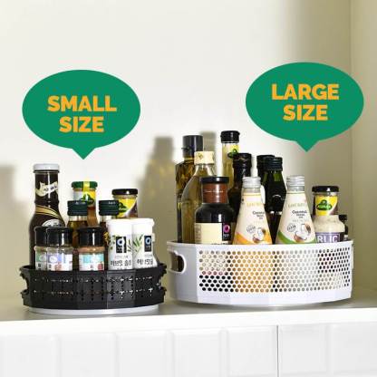 Wide Applications The turntable for cabinet shelves being used for cosmetics, bathroom essentials, shampoos and shower gels, for spices and herb jars, fruits, jams and jellies, snacks, DIY arts and crafts hardware and much more!