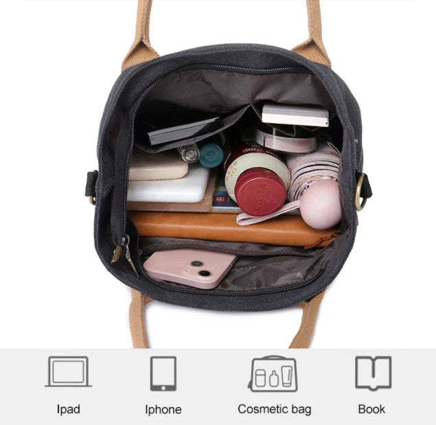 This large capacity canvas bag can store all your essential items on travel. Large opening design, easy to find and take out the items.