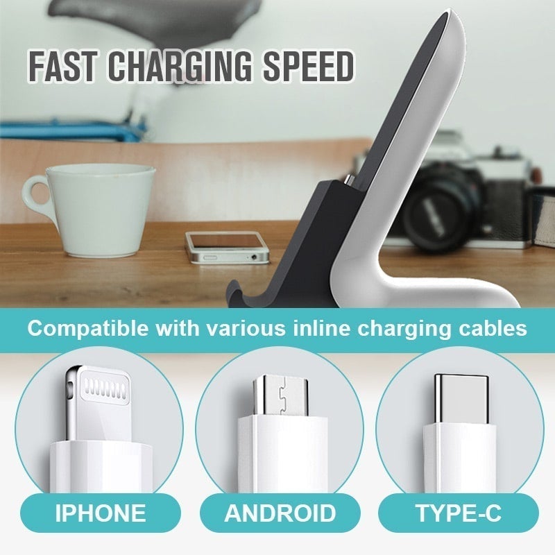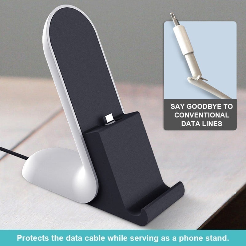 The traditional charging stand is not only slow but also expensive. But our products are different, because it achieves charging your phone by using your original data cable, the speed is the same as wired charging, which allows you to charge your phone quickly. And the price is also cheap. It is also compatible with Lightning, Micro USB and Type C.